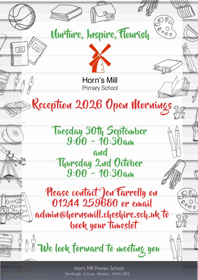 We would love to see you at one of our Open Mornings- Please contact Jen in the office to book your place. 01244 259680 - admin@hornsmill.cheshire.sch.uk